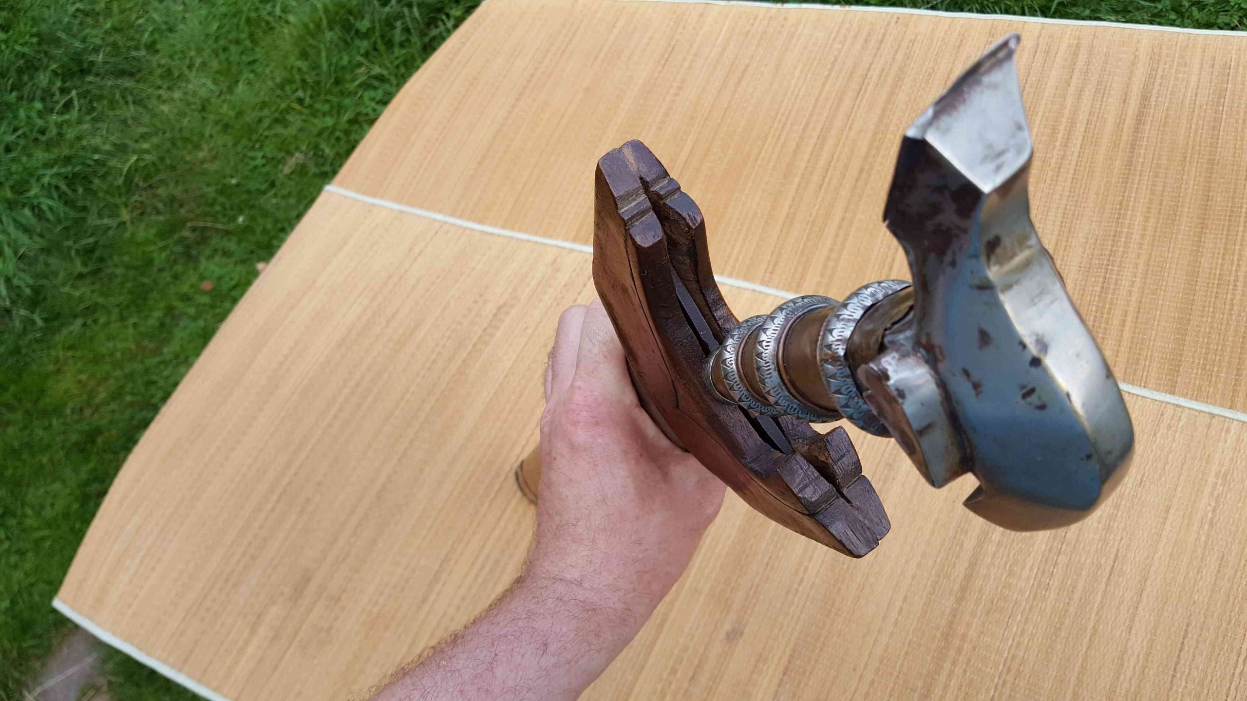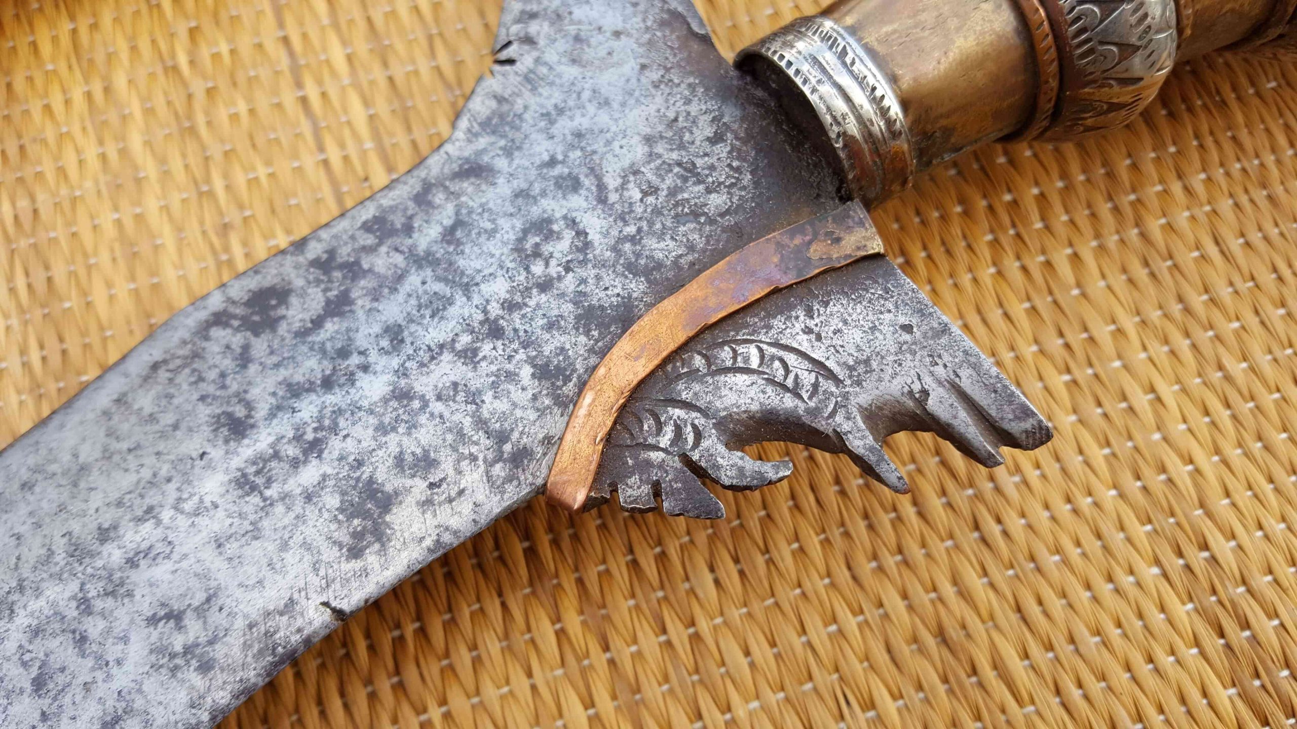 Wooden scabbard with white metal fittings and decorated with silver coins and a mother of peal disc. Large sized white metal and copper Handel the pommel of the handle made to represent a Cockatoo Head.