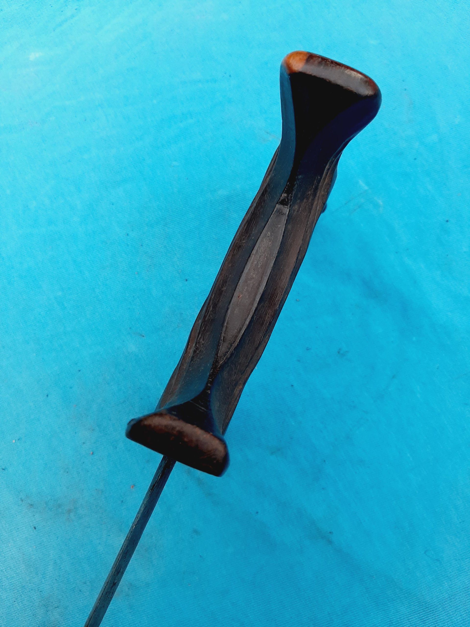Antique 19th century “FUZZY WUZZY ” Warriors Fighting in the Armies of the Mad Muller of Sudan Against the British and Egyptian Forces. The dagger with pronouncely curved blade towards the tip. Blade length approximately 29cm long measured along the length of the blade following the curve. Black ‘X’ type Hardwood handle ,missing part of the handle. Sir Winston Churchill fought with Nottinghams 17th Lancers at the Battle of Omdurman Sudan 1898.